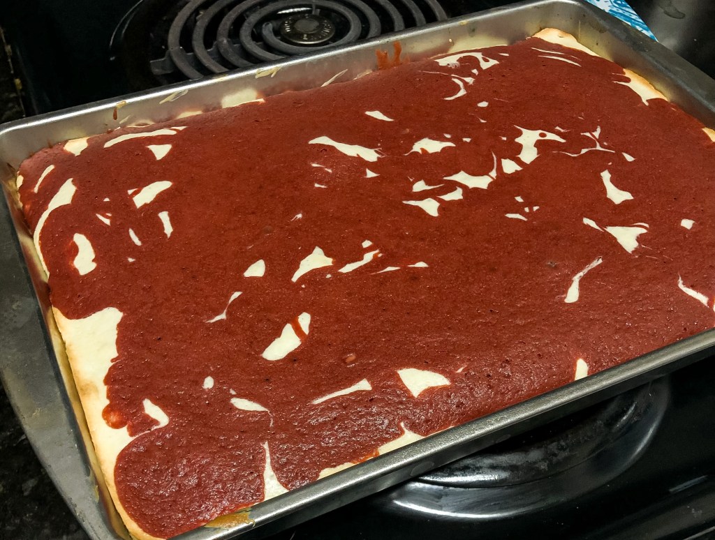 - Pour the cream cheese mixture on top of the red velvet layer and smooth mixture till it reaches all the edges.