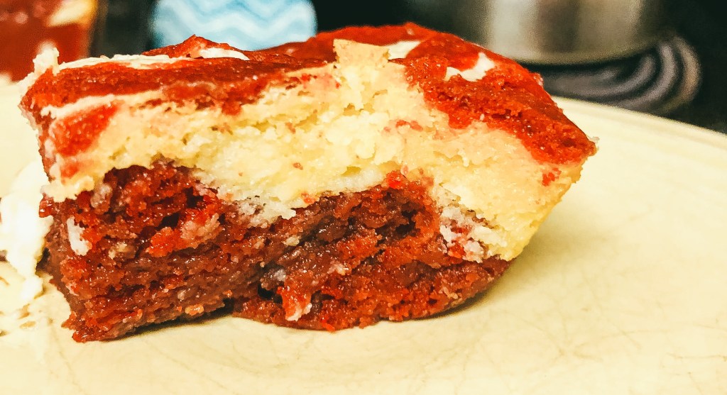- Drop spoonfuls of the remaining red velvet batter (that you mixed with milk) onto the top of the cheesecake layer. Drag the tip of a knife through the red velvet and the cheesecake layers to create swirls.